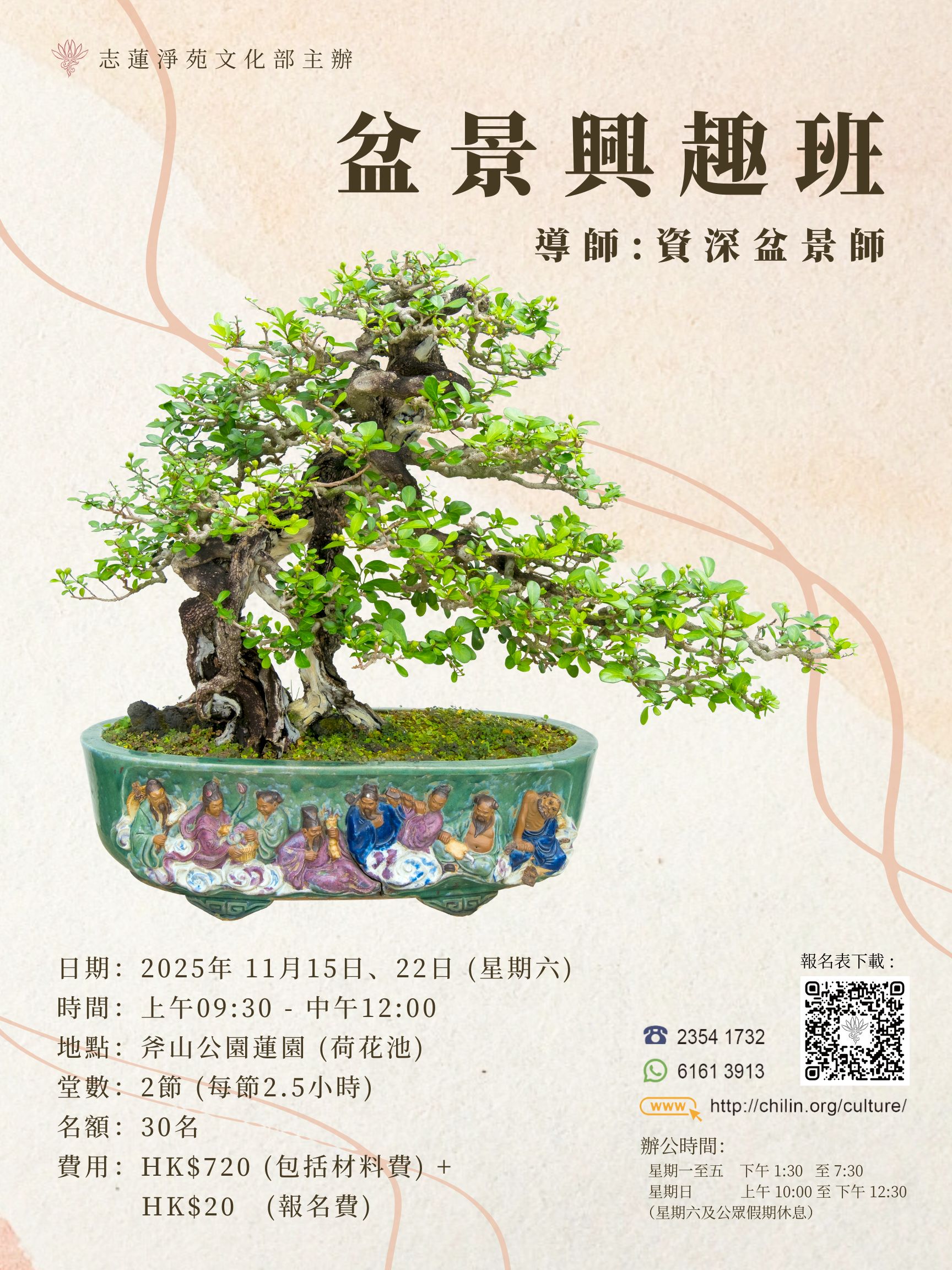 盆景兴趣班 (2025.11) 本兴趣班每年在春、夏、秋三季开班,由导师详细讲解盆景造型及修剪技法,学员透过实践及日后追随导师练习,对盆景艺术当有更深刻认识。 【上课日期:2025年11月15、22日】 导 师: 本院众导师 导师简介: 课程编号:C609 开课日期:2025年11月15日 上课时间:逢星期六 上午9:30-12:00 上课地点:斧山公园莲园 (荷花池) 堂 数:2堂 名 额:约30人 学 费:$720(含材料费) 课程对象: 学员自备: