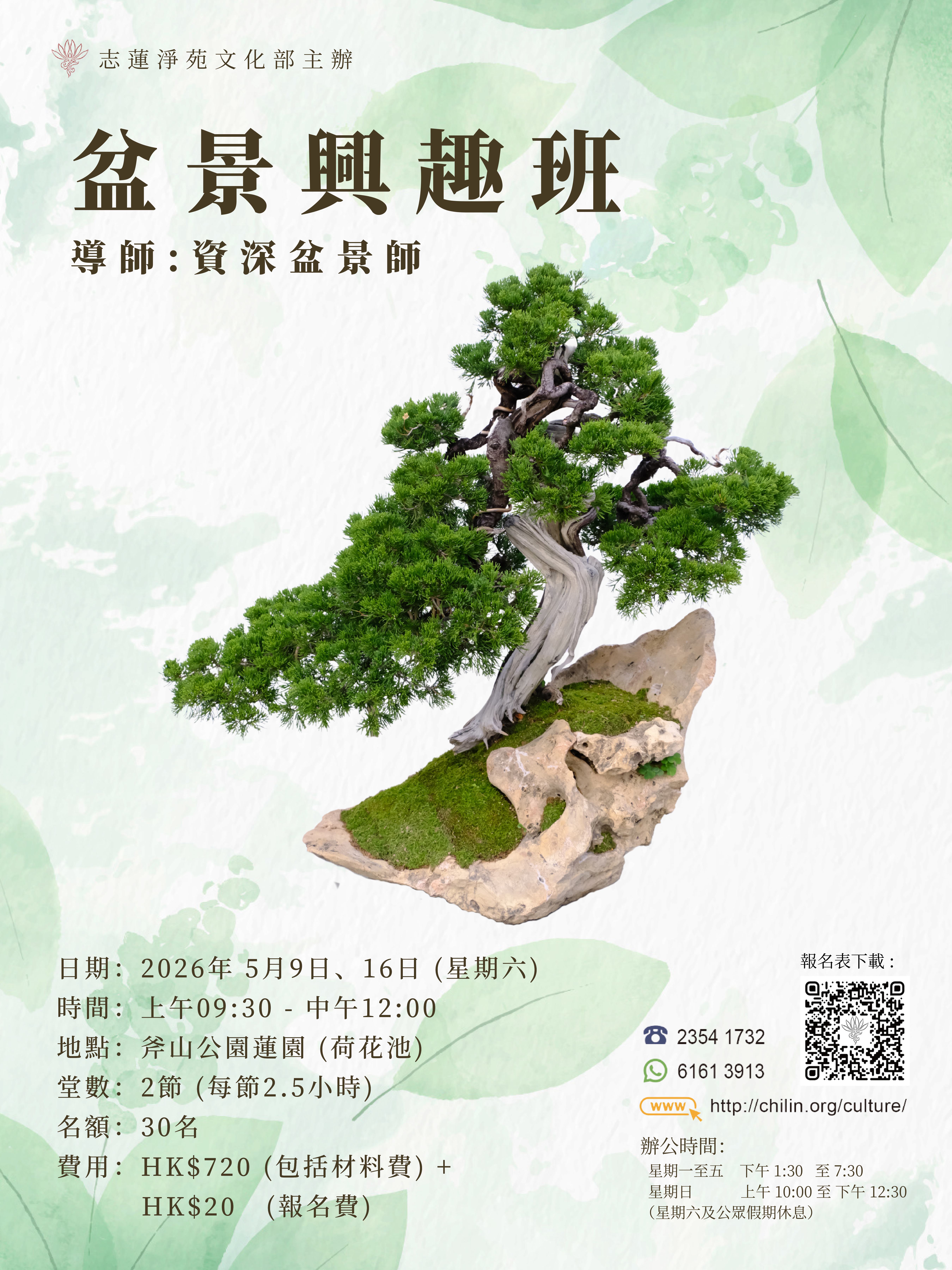 盆景兴趣班 (2026.05) 本兴趣班每年在春、夏、秋三季开班,由导师详细讲解盆景造型及修剪技法,学员透过实践及日后追随导师练习,对盆景艺术当有更深刻认识。 【上课日期:2026年5月9、16日】 导 师: 本院众导师 导师简介: 课程编号:C609C 开课日期:2026年05月09日 上课时间:逢星期六 上午9:30-12:00 上课地点:斧山公园莲园 (荷花池) 堂 数:2堂 名 额:约 30人 学 费:$720(含材料费) 课程对象: 学员自备:
